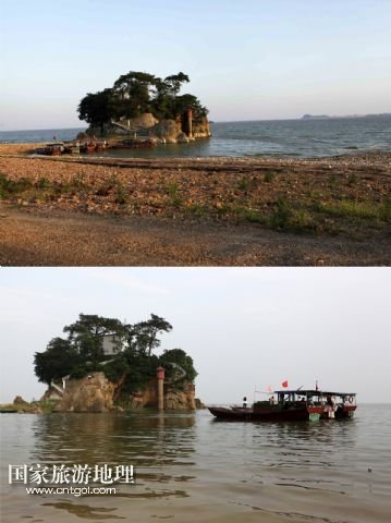 這張拼版照片顯示的是:8月8日,水位低落的鄱陽(yáng)湖江西省都昌縣印山島水域(上圖);5月19日,漲水中的鄱陽(yáng)湖江西省都昌縣印山島水域(下圖)。