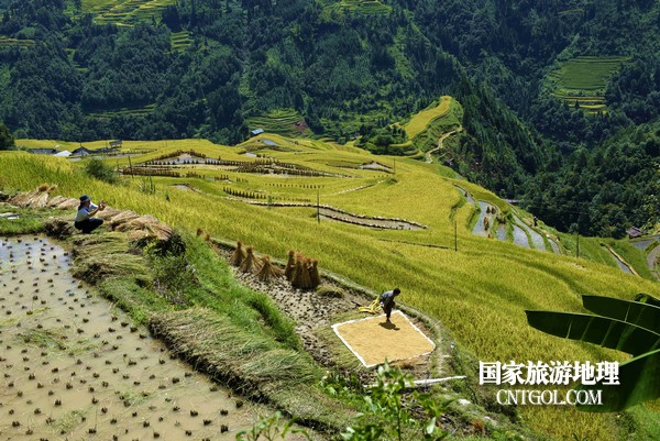 9月5日,貴州省黔東南苗族侗族自治州從江縣加榜鄉(xiāng)黨扭村和加車村近萬(wàn)畝水稻開(kāi)鐮收割。圖為:加頁(yè)村層層梯田